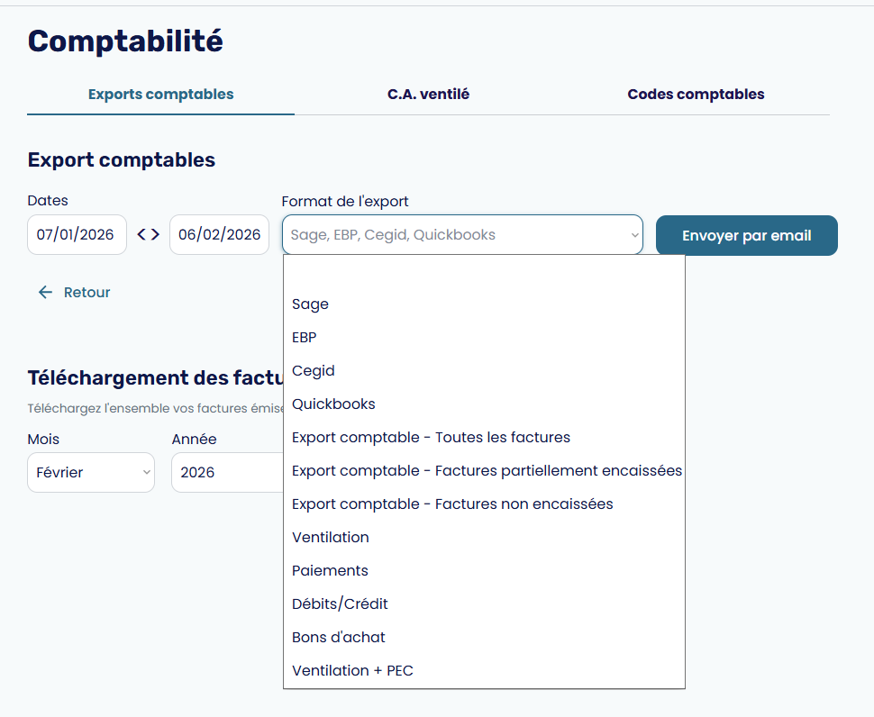 - Export comptable: Récapitulatif de toutes vos factures sur une période donnée.