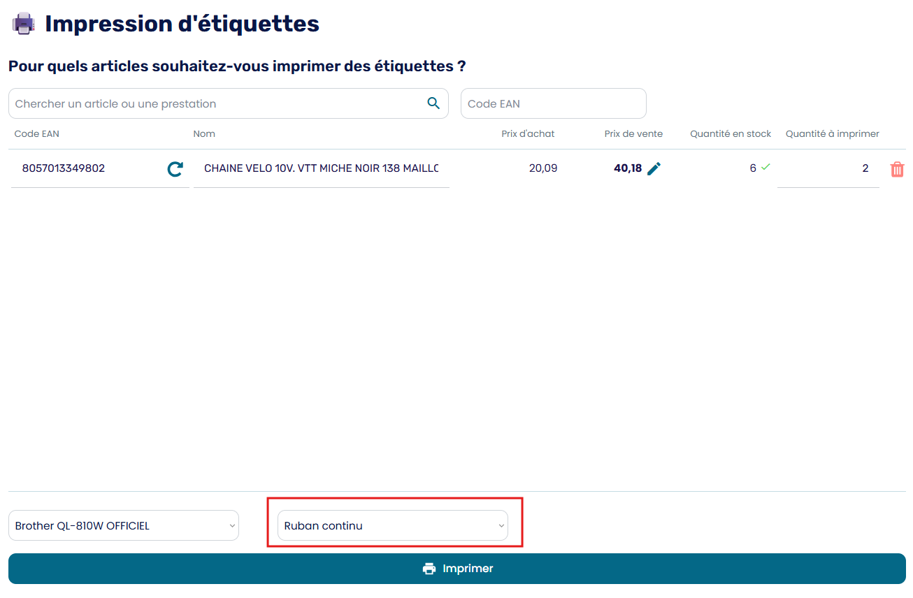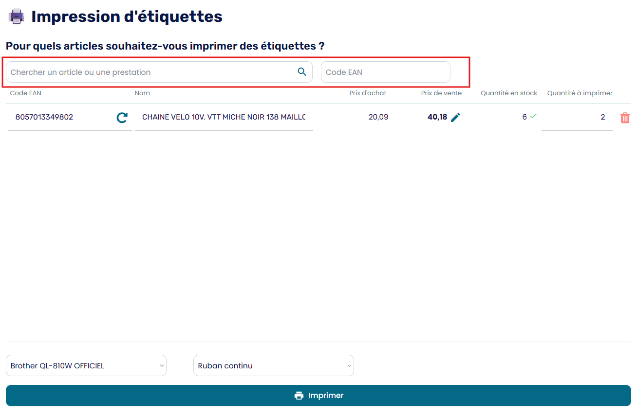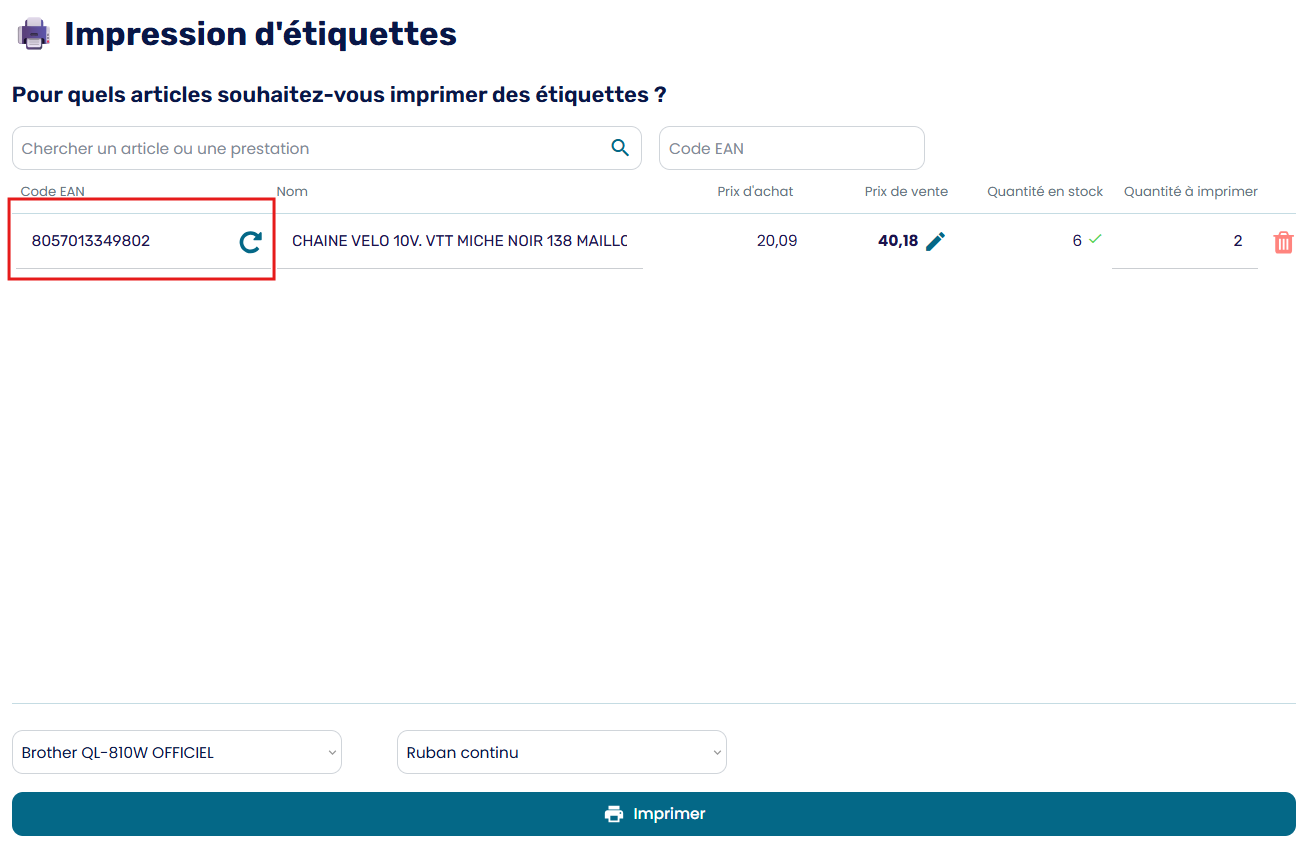 Cliquez sur Stock => Actions => Impression d'étiquettes => Ajouter un article dans la barre de recherche => Ou en le scannant => Choisir un code EAN => Choisissez l'imprimante "BROTHER" => choisir le type d'impression => Imprimer.
