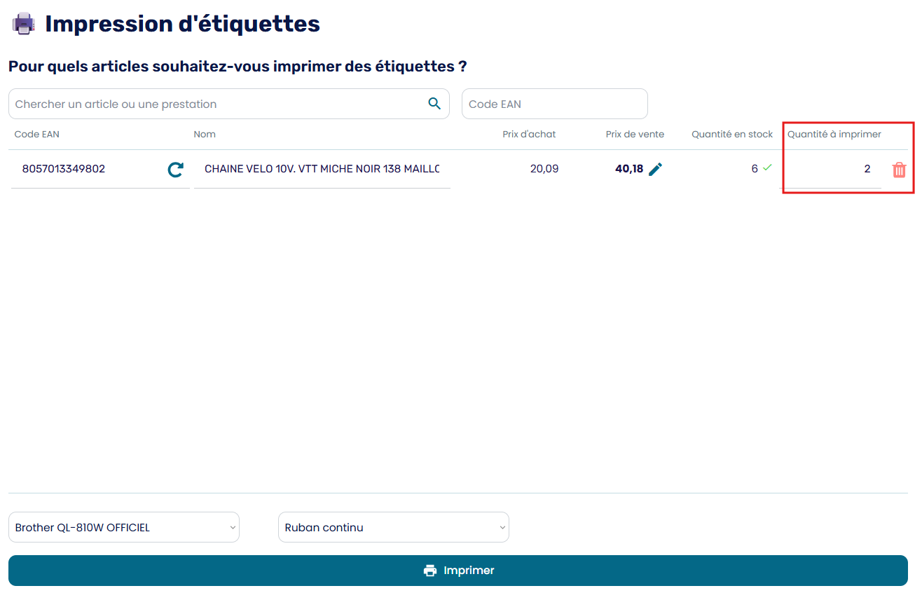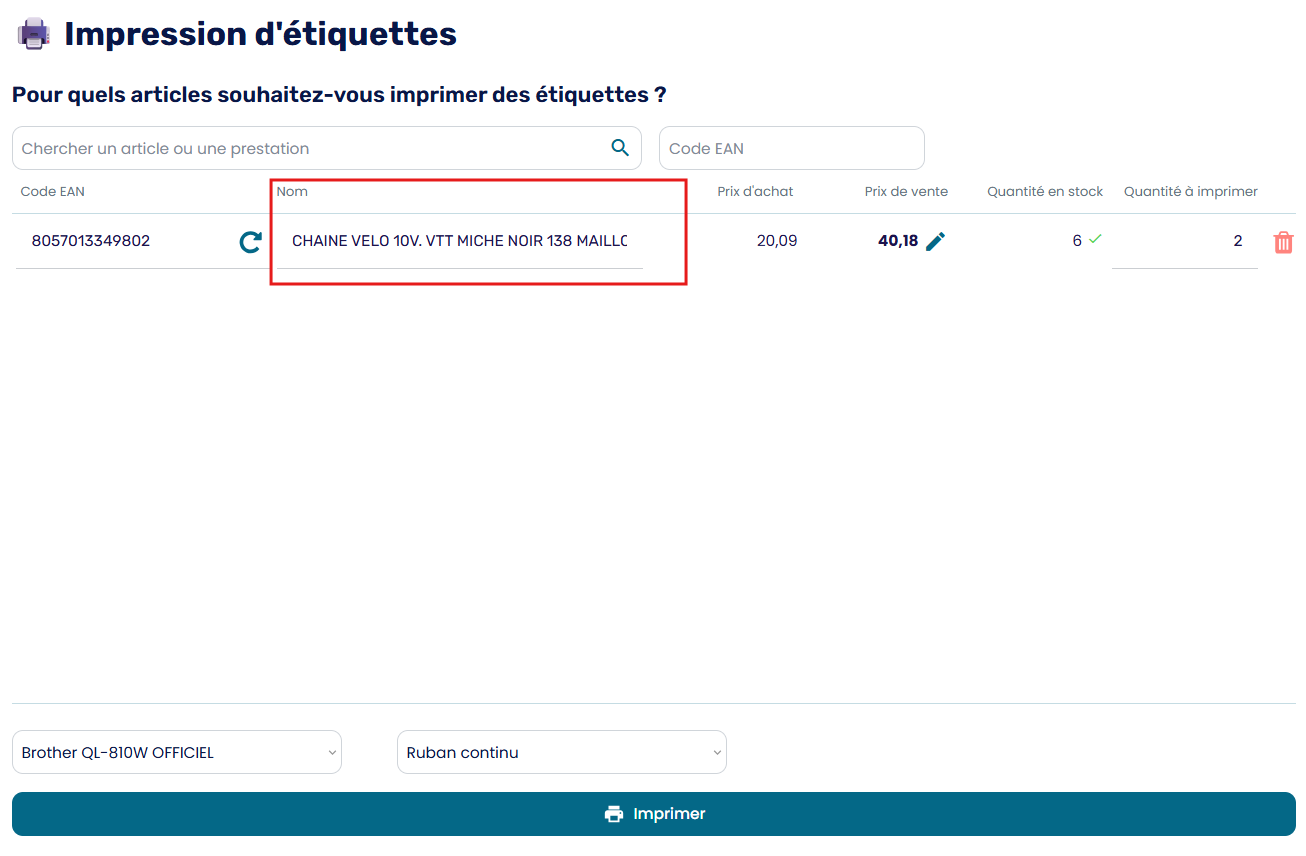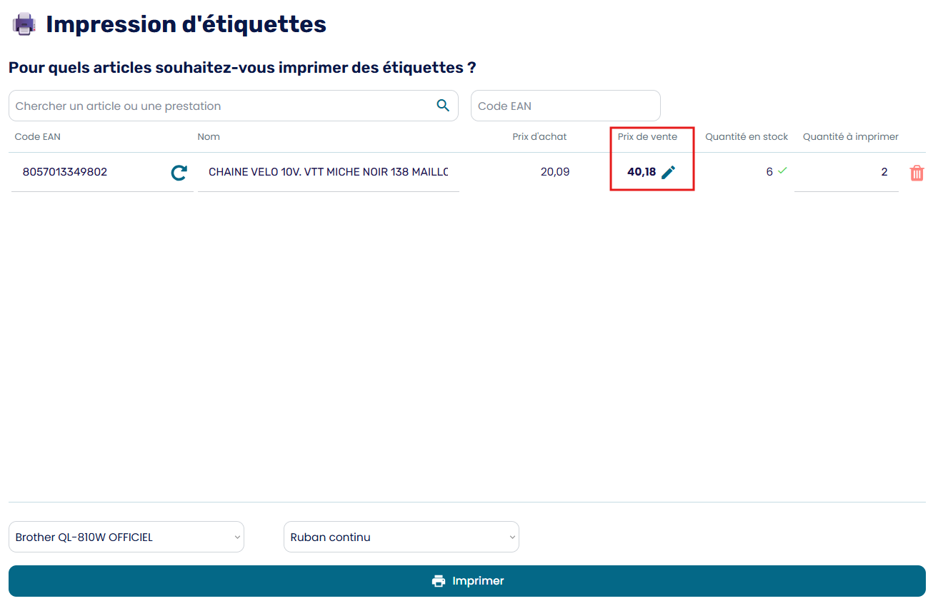 Cliquez sur Stock => Actions => Impression d'étiquettes => Ajouter un article dans la barre de recherche => Ou en le scannant => Choisir un code EAN => Choisissez l'imprimante "BROTHER" => choisir le type d'impression => Imprimer.