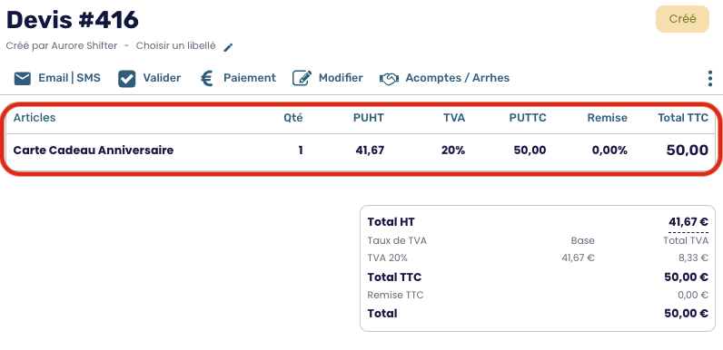 Ajoutez la prestation « Carte cadeau » dans un devis et indiquez le montant souhaité (ex. : Carte cadeau → 50 €).
