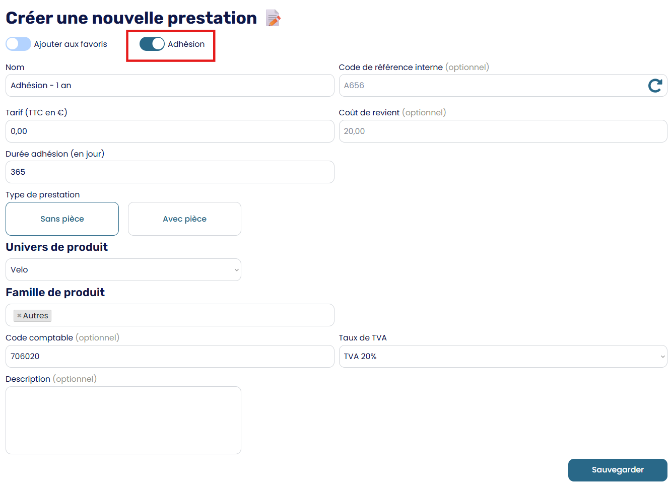 - Sélectionnez "adhésion" en haut de la page de création de la prestation