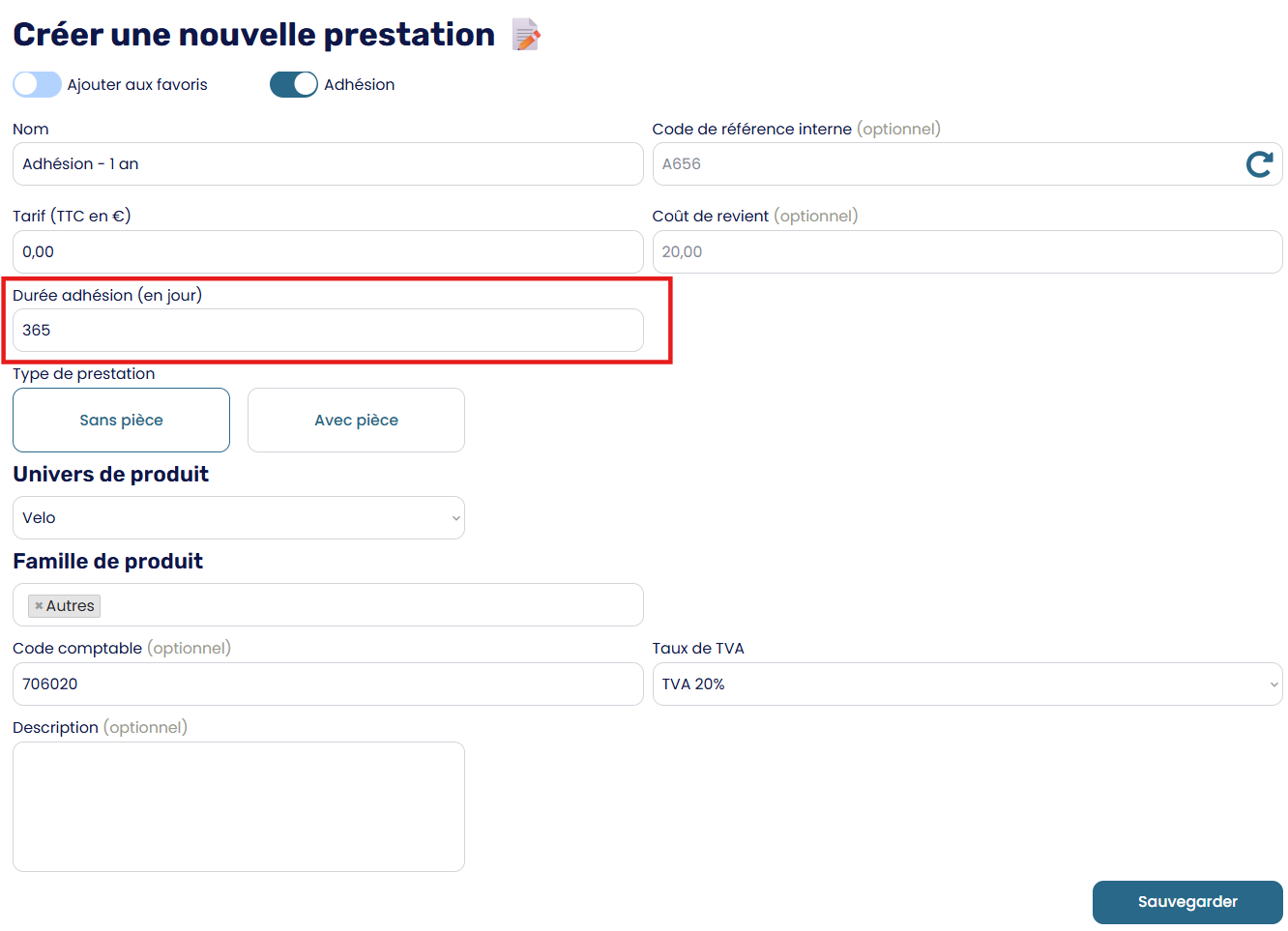 paramètres > prestations > action > ajouter une prestation > adhésion