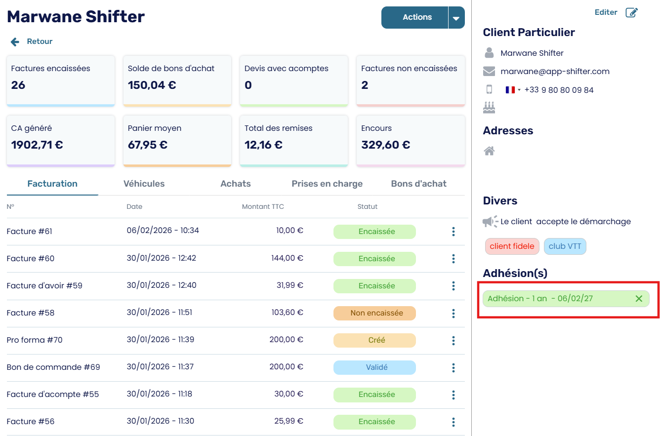 - Une fois vendu, à votre client un tag apparaitra sur sa fiche client avec une date de fin.
