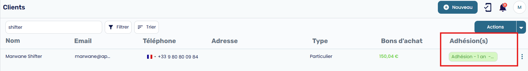 Sur Shifter, vous pouvez créer une prestation « adhésion » qui, une fois vendue à un client, lui attribuera automatiquement un tag spécifique permettant d’identifier visuellement son statut de membre ainsi que la durée de son adhésion.